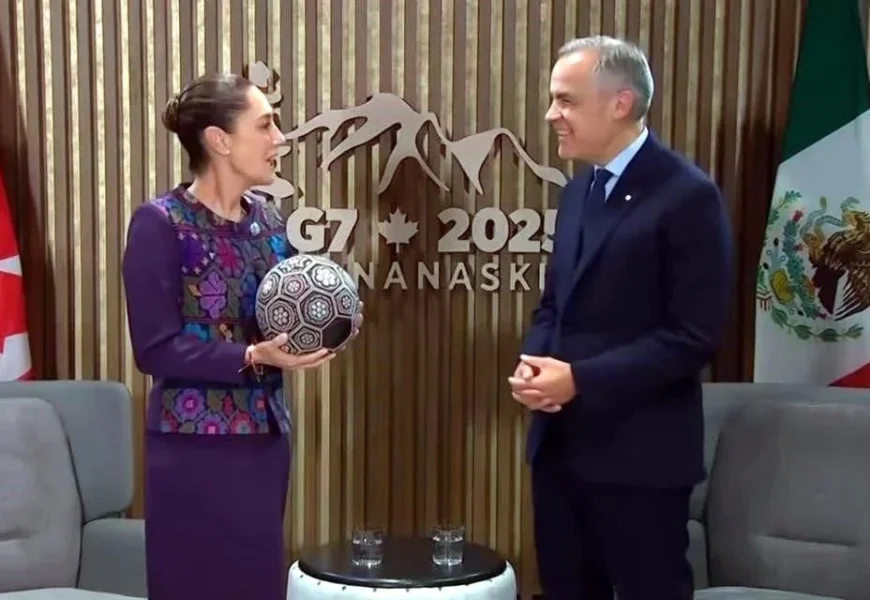 – “Yes, sí”, soltó también el canadiense.Previamente, Sheinbaum regaló a Carney un balón de futbol, como mensaje de la unión trilateral que vivirán las naciones de América del Norte, en 2026, con la Copa Mundial.”¡Una pelota!”, soltó sorprendido el canadiense.”Le agradecemos mucho la invitación y quiero hacerle un regalo, porque vamos a tener el próximo año un Mundial compartido. Este está hecho por indígenas wixárikas, entonces es un regalo, es la amistad, a través del deporte”, manifestó la mexicana.En tono relajado, el Primer Ministro aseguró que, para la realización de ese encuentro deportivo, los intereses trilaterales ya están alineados.”Muchísimas gracias, esto es maravilloso y esta es un área donde México, Canadá y nuestro tercer coanfitrión, Estados Unidos, estamos totalmente alineados en nuestro entusiasmo y en nuestro amor por este juego hermoso”, expresó.El canadiense hizo un reconocimiento a la importancia del papel de México en la cooperación internacional y se pronunció por buscar el progreso compartido.”Fue inmediatamente claro, desde nuestra primera discusión en la otra sala, el valor duradero del liderazgo de la presidenta y la importancia de que México esté en el centro de la cooperación internacional”, señaló.”Y, si me permite, señora presidenta, voy a citarle que no hay progreso sin que se comparta. Y este es el espíritu que trae la presidenta, que trae México y que Canadá comparte con usted”.Sheinbaum agradeció la invitación y subrayó la necesidad de fortalecer la relación bilateral.”Muchas gracias, Primer Ministro, por esta invitación. Ha sido muy importante para nosotros. Valoramos mucho la relación con Canadá, no solamente en comercio, sino también en cultura, en amistad. Muchos mexicanos también viven aquí en Canadá”, dijo.Antes de reunirse con Carney, Sheinbaum sostuvo encuentros bilaterales con el presidente del Consejo Europeo, António Costa, y la presidenta de la Comisión Europea, Ursula von der Leyen, a quien invitó a visitar México.También tuvo una reunión con el Canciller federal de Alemania, Friedrich Merz, con quien conversó sobre la relación estratégica, valores compartidos, oportunidades de cooperación económica y trabajo conjunto.Fuera de la agenda inicial, Sheinbaum dialogó con Lee Jae-Myung, recién electo presidente de Corea del Sur.”Para acercar a nuestros países y enriquecer los lazos entre ambos pueblos”, expresó.La presidenta saludó a otros jefes de Estado como el brasileño, Inacio Lula Da Silva, y el sudafricano Cyril Ramaphosa.