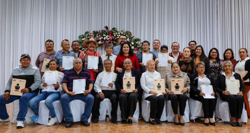 De manera simbólica, autoridades hicieron entrega de certificados de primaria y secundaria a Gabriela Barajas Pineda, María Asunción González Moreno, Eladio Vivar Segura, Pascual Domínguez Nájera, Diego García López y Carlota García Lozano.