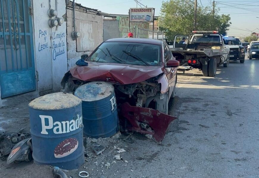 El propietario de un Nissan Versa guinda con placas de Chihuahua, perdió el control y se estampó contra unos tambos metálicos llenos de concreto que sirven de contención y que estaban colocados sobre la banqueta de una panadería.