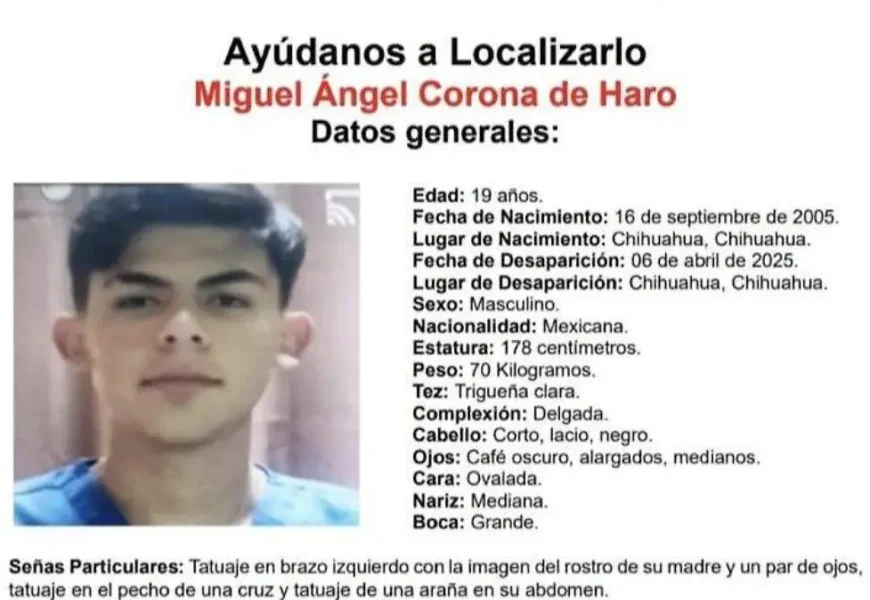 La Fiscalía General del Estado de Chihuahua ha emitido una ficha de búsqueda para dar con el paradero de Miguel Ángel Corona de Haro, un joven de 19 años que fue reportado como desaparecido desde la noche del pasado 6 de abril de 2025 en la ciudad de Chihuahua.