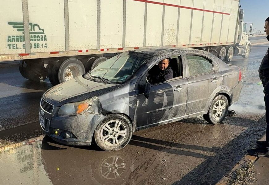 Ciudad Juárez— Una mujer resultó golpeada cuando iba en su vehículo, el cual fue chocado por un tráiler en el Libramiento Independencia y la carretera Juárez-El Porvenir, esta mañana.